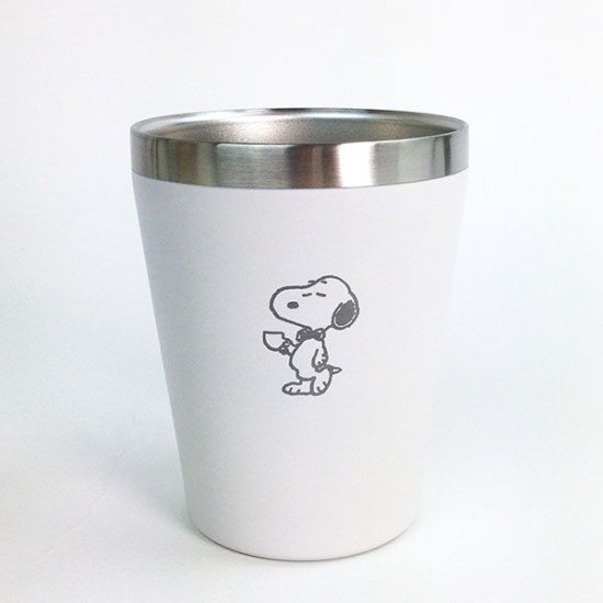 2つ目に紹介するステンレスタンブラーは、こちらです。白を基調としたデザインが美しいですよね。スヌーピーのおかげで、シンプルながら飽きの来ないデザインとなっています。サイズは、11×8.5cmです。