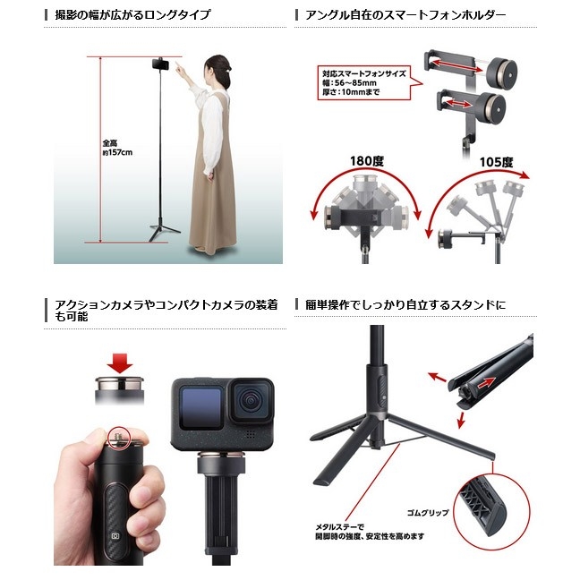 簡単操作でカメラとスマートフォンどちらも取り付けることが出来る、一台二役のロングスタンド。最大で約157cmまで伸長可能となり、これまで以上に自由度の高い撮影体験を提供します。