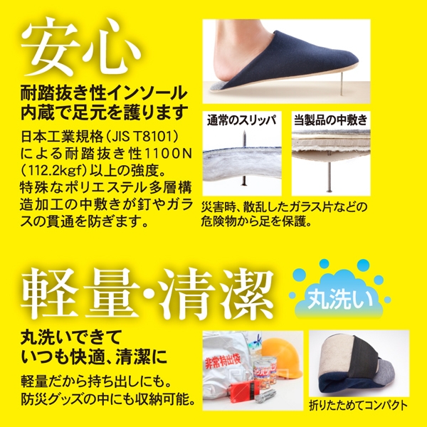 床に落ちたガラス片などからを足元をいざというときに守る防災ルームシューズです。