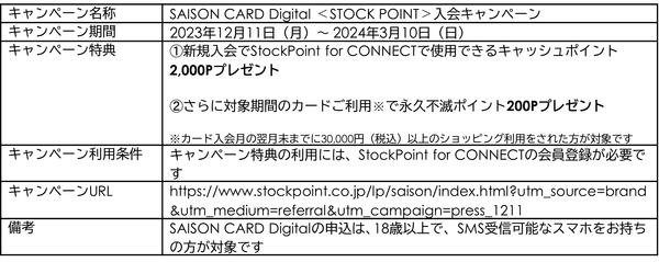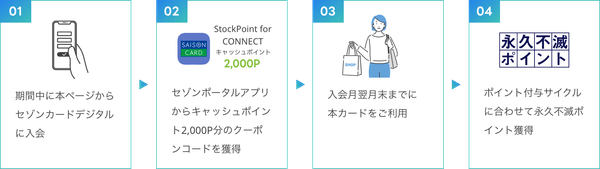 本キャンペーンで、SAISON CARD Digitalをお申込みいただくと、StockPoint for CONNECTで利用できるキャッシュポイントをプレゼントいたしますので、今まで提携ポイントを保有しておらずポイント運用をご利用いただけなかった方も体験して頂くことが可能となります。