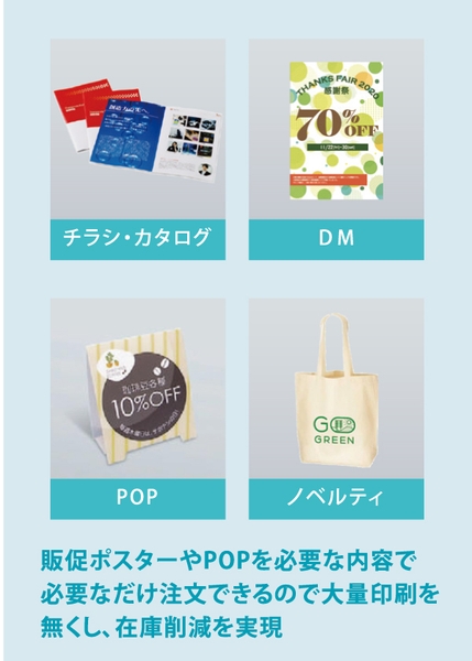 デザイン編集機能でユーザーが文言や日付を修正して注文できるチラシやPOP、DM、各種ノベルティグッズを掲載し、各拠点からの要望を受けて、都度デザイン会社等とのやり取りをすることなく、ご自身で販促物を簡単に注文できるようになります。