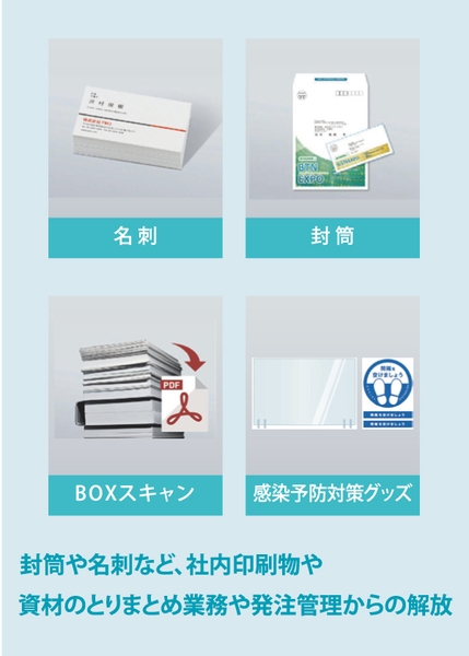 オンラインで名刺を修正・注文、封筒や会社案内などの印刷物の手配、ニューノーマルにおけるオフィス書類の電子化推進のために、段ボールに書類を入れて郵送するだけでスキャンしてPDFデータを納品するスキャンBOXサービス、さらにオフィス内の感染対策向けに飛沫防止パーテーションなどの物販商品を標準掲載し、総務部の発注業務を軽減します。