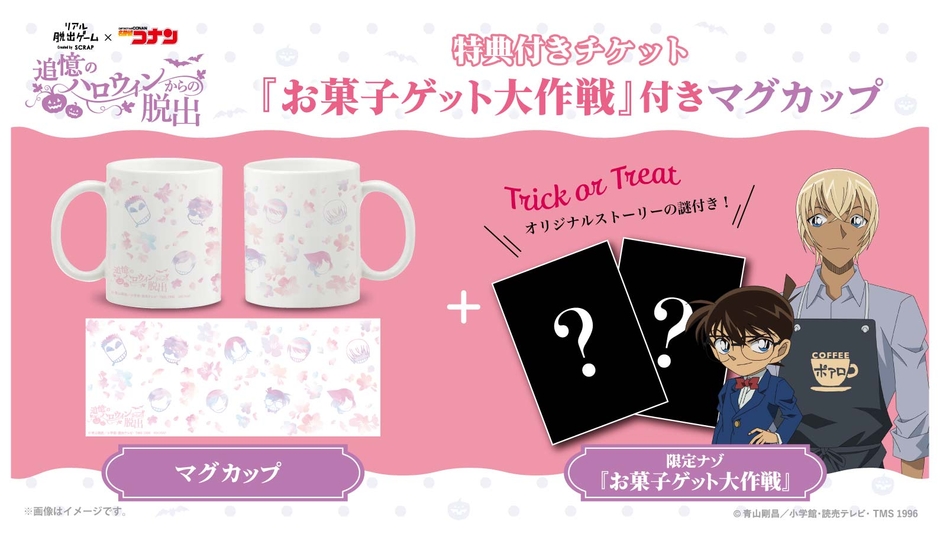 「『お菓子ゲット大作戦』付きマグカップ」は、淡いピンクでキャラクター達があしらわれたオリジナルデザインのマグカップに、少年探偵団と一緒に挑む謎『お菓子ゲット大作戦』がついてきます。『お菓子ゲット大作戦』謎のストーリーには、安室も登場!