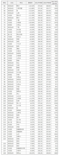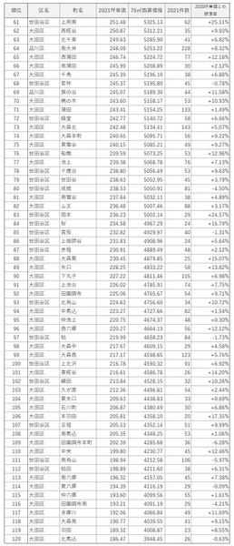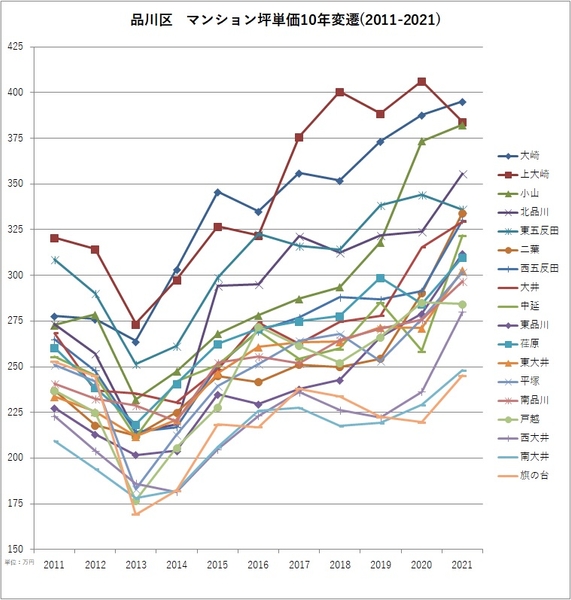 2011年と2021年のマンション坪単価より騰落率を算出。