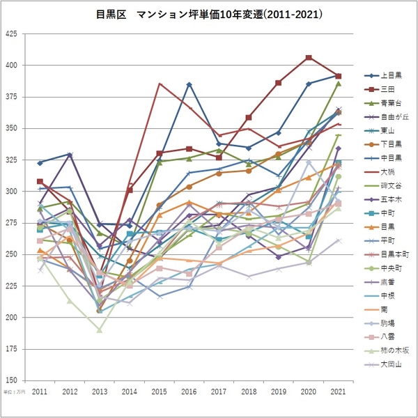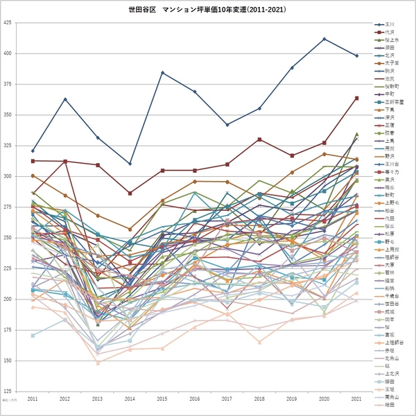 ■各区での町名別マンション坪単価 2011-2021変遷