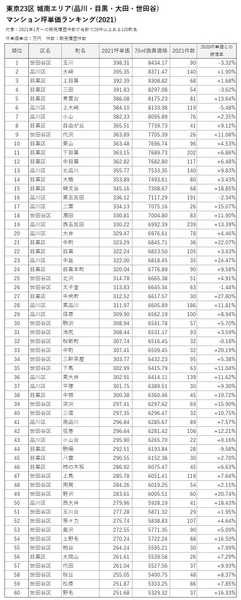「マンションレビュー」のデータで見る「東京23区のマンション相場変遷10年」 城南エリアでの町名ランキングを発表!