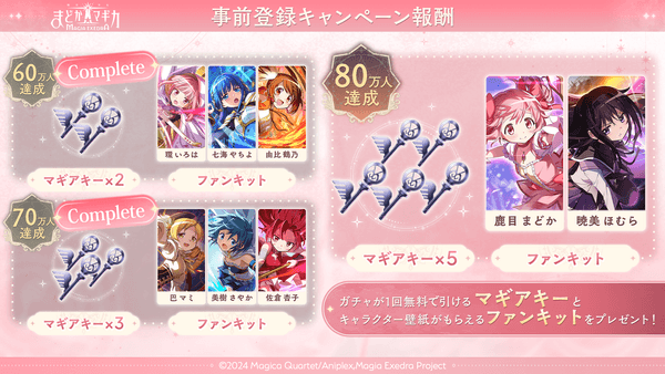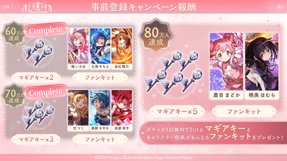 事前登録数に応じて、ゲーム内アイテムのガチャが引けるマギアキーやキャラクターの壁紙がもらえるファンキットを獲得することができます!