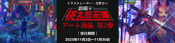 友野るい氏が7年間構築し続けている連作『戯画☆桃太郎奇譚』が持つ魅力を、「DNP高精彩出力技術 プリモアート®」による複製画に加え、新しくアクリルでも楽しめる商品を販売いたします。