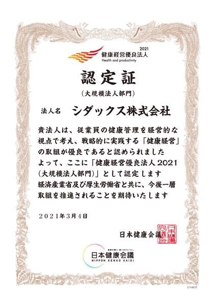 シダックス株式会社は、3月4日、経済産業省により「健康経営優良法人2021(大規模法人部門)」に初めて選定されました。これを励みに、今後とも健康を重視した経営を推進し、事業を通じた「社会課題の解決」を行う企業として、強い信念を持って努力し続けてまいります。