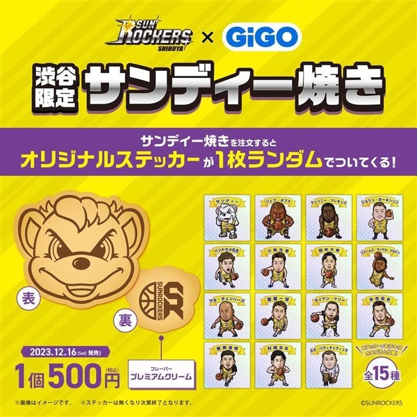 現在GiGO渋谷では、サンロッカーズ渋谷マスコットキャラクターのサンディーをかたどった「サンディー焼き」を好評発売中です。1個ご購入につき、ランダムでホログラムステッカーを1枚プレゼントいたします。