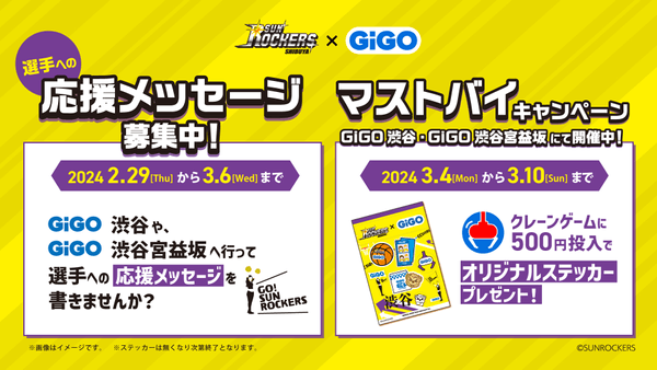 当社はサンロッカーズ渋谷と2023年7月からスポンサー契約を締結し、チームを応援してきました。今回、GiGO初冠試合である「GiGO presents シーホース三河戦」を記念し、「GiGO渋谷」「GiGO渋谷宮益坂」の渋谷2店舗にて応援イベントを開催いたします。