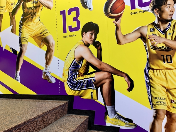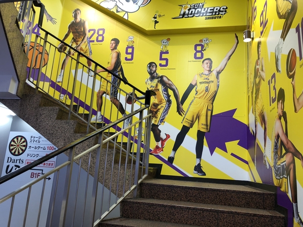 「GiGO渋谷」の階段スペースには、サンロッカーズ渋谷の選手の「実物等身大の写真」を使ったウオールアートも常設。試合の前後に立ち寄って、バスケットボールをプレイする躍動感や選手の大きさを体験したり、当スペース専用の、田中 大貴選手の隣に座ったり、ジョシュ・ホーキンソン選手にハイタッチしたり、選手に触れるような気分になれます。