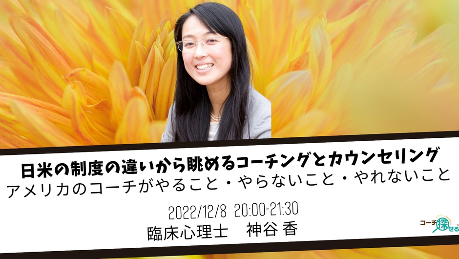 株式会社シェヘラザード(住所:東京都中央区 代表:坂本祐央⼦)は、コーチを無料で探せるプラットフォーム 「コーチ探せる」主催12⽉オンラインセミナー「日米の制度の違いから眺めるコーチングとカウンセリング ~アメリカのコーチがやること・やらないこと・やれないこと~」を2022年12月8日(木) 20時より開催致します。