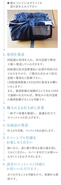 ただし、側生地が破れていたり、綿が極端に傷んでいる場合は仕立て直しができない場合があります。事前にご相談ください.