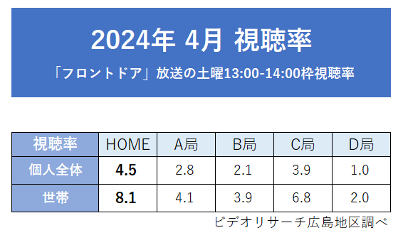 広島ホームテレビ(本社:広島市中区)で毎週土曜ごご1時から放送、ひろしま深掘りライブ「フロントドア」は、2024年4月の月間平均視聴率で個人全体・世帯いずれも同時間帯1位(ビデオリサーチ調べ、広島地区)を記録しました。