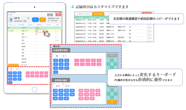 共通の機能として”記録の経過参照”や”前回記録のコピー”を搭載しております。