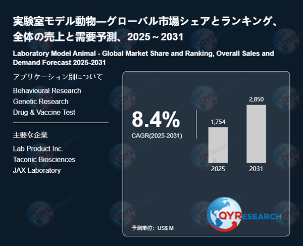 QYResearchが発表した新たな市場調査レポート「実験室モデル動物―グローバル市場シェアとランキング、全体の売上と需要予測、2026~2032」によると、世界の実験室モデル動物市場規模は2024年の約1585百万米ドルから2025年の1754百万米ドルへと順調に拡大すると見込まれ、予測期間中は年平均成長率(CAGR)8.4%で成長し、2031年には2850百万米ドルに達すると予測されている。