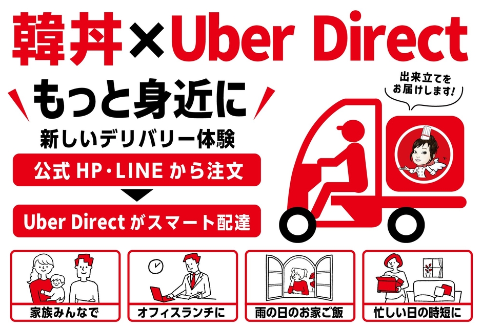 今回の導入により、お客様は韓丼の公式HPやテイクアウト&デリバリーページ、LINE から直接ご注文いただけるようになり、Uber 配達パートナーによるスマートなお届けが可能となります。