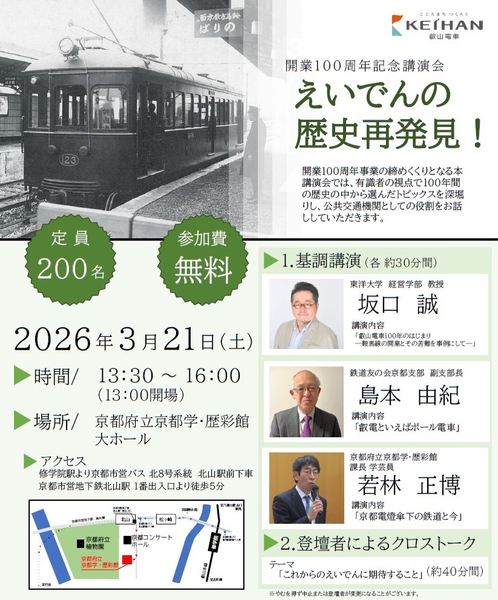 2025年3月20日より「叡山電車開業100周年事業」を展開してまいりましたが、本事業の締めくくりとして、2026年3月21日(土)に京都府立京都学・歴彩館において「開業100周年記念講演会『えいでんの歴史再発見!』」を開催。3名の有識者をお招きし、それぞれの視点で100年間の歴史の中から選んだトピックスを深掘りし、公共交通機関としての役割をお話しいただきます。