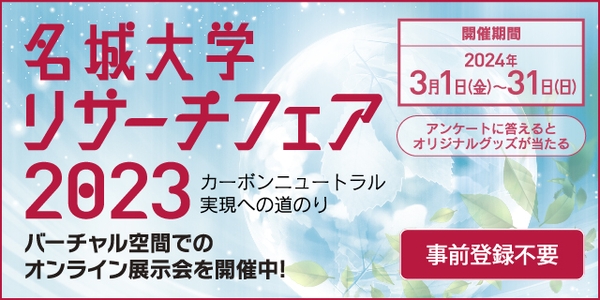 本学は2024年3月1日から3月31日まで、研究力と研究シーズを広く社会に発信し、共同研究など産官学連携のきっかけづくりを目的に、3Dバーチャル空間で「名城大学リサーチフェア2023」を開催します。
