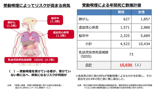 ○年間15,000人が、受動喫煙を受けなければ、これらの疾患で死亡せずに済んだと推計されています。