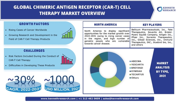 世界のキメラ抗原受容体(CAR-T)細胞療法市場は、2022年から2031年の間に約30%のCAGRによる成長を目撃する。世界中でがん症例を増やし、市場の成長を牽引