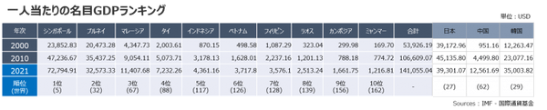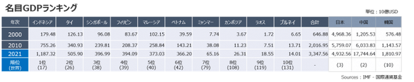多くの国々が高い経済成長率を記録しており、ASEAN地域合計では2000年から2021年までの約20年間で、名目GDPが5倍以上に増加しています。