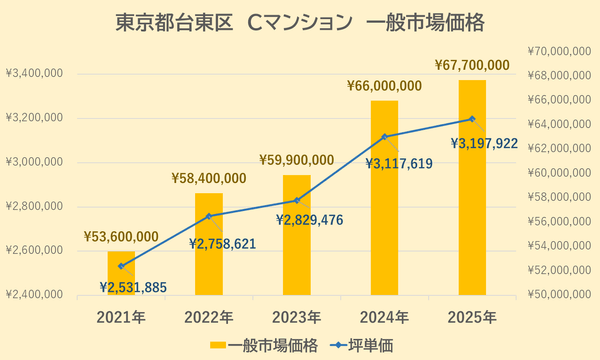 Cマンションの一般市場価格・坪単価の推移は上記【図5】の通りです。