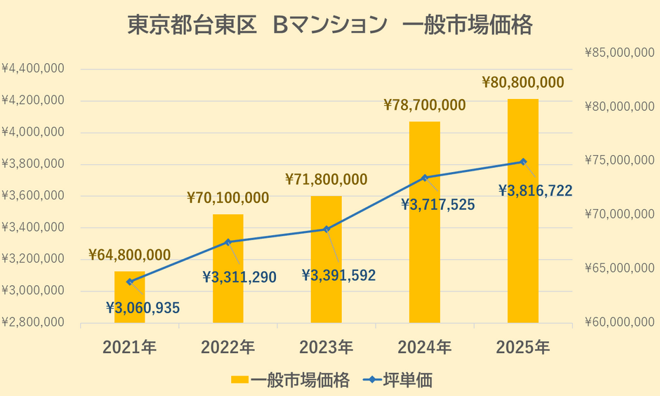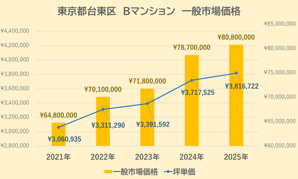 Bマンションの一般市場価格・坪単価の推移は上記【図4】の通りです。