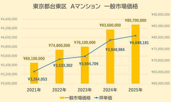 Aマンションの一般市場価格・坪単価の推移は上記【図3】の通りです。