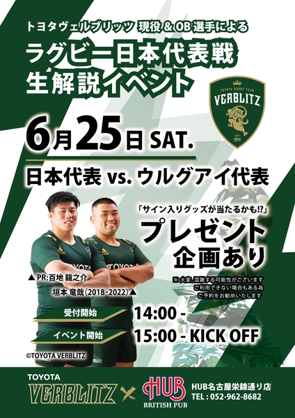 株式会社ハブ(本社:東京都千代田区、代表取締役社長:太田 剛)が運営するHUB名古屋栄錦通り店は、トヨタヴェルブリッツの現役選手とOBによる、ラグビー日本代表戦のリアルタイム解説イベントを開催いたします。