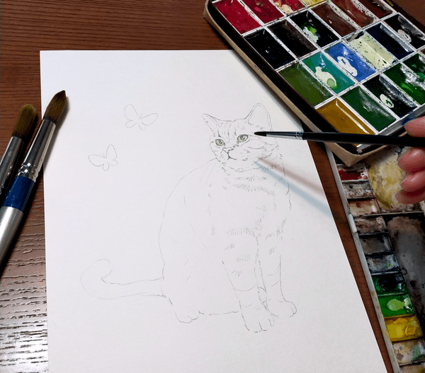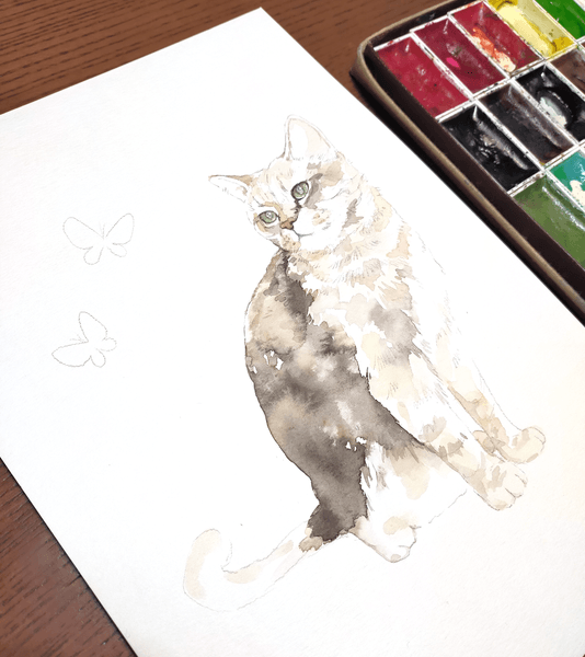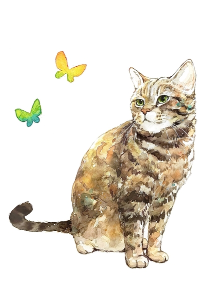 自由の象徴である猫と蝶が共存することで、束縛から解放された世界観を表現しています。蝶の鮮やかな色彩が猫の毛並みに溶け込むことで、統一感と温かみのある仕上がりに。透明水彩の繊細なタッチが特徴で、光の加減によって異なる表情を楽しめるアートピースのような一本です。