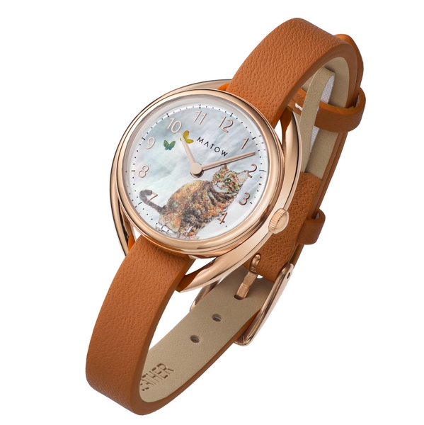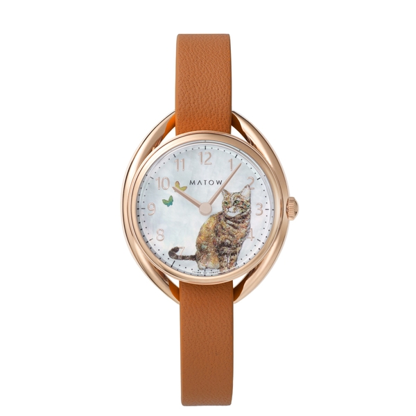 本作の文字盤には、mutsuki氏が描く「自由に空を舞う蝶に目をやる猫」をデザイン。