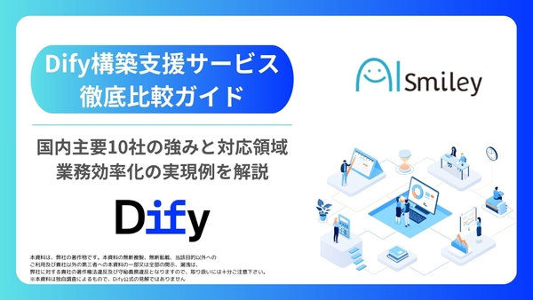 AIポータルメディア「AIsmiley」を運営する株式会社アイスマイリー(東京都渋谷区、代表取締役:板羽 晃司)は、Dify構築支援サービスの情報をまとめた「Dify構築支援サービス徹底比較ガイド」を、2025年9月24日(水)に公開しました。