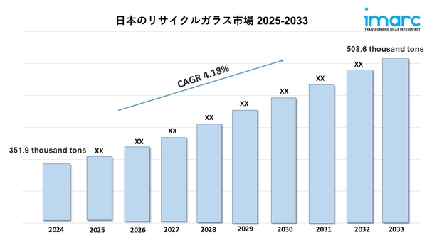 日本のリサイクルガラスの市場規模は、2024年に351.9千トンと評価されました。IMARCグループは、2025年から2033年の間に年平均成長率(CAGR)4.18%で、2033年までに市場が508.6千トンに達すると予測しています。