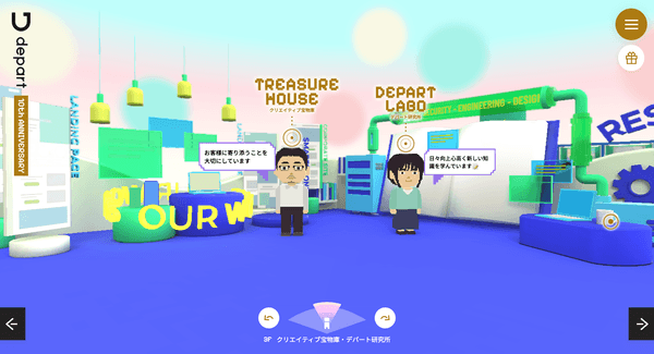 全体としては、百貨店のフロアをぐるりと見回したりフロア間を移動するような構成を採用し、訪れた人が自然と企業の世界観を楽しみながら理解できる設計にしています。3Dは平面デザインと違い、360度回転させたりズームして細部まで見ることができます。これはとても自由度が高くできることが増える反面で、ユーザーがどこで何をすべきか迷う可能性が高くなる懸念があります。そこで今回は、視点をあえて固定し、「ぐるりと見渡す」ような動きに制限。