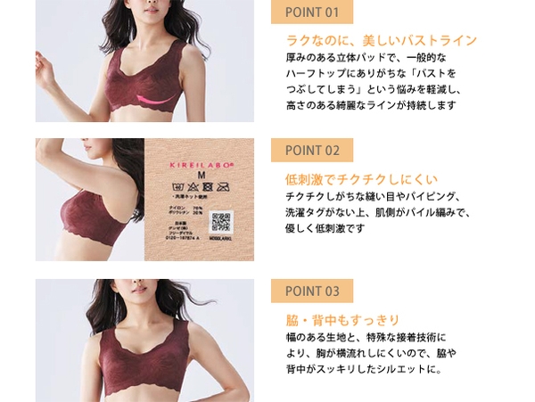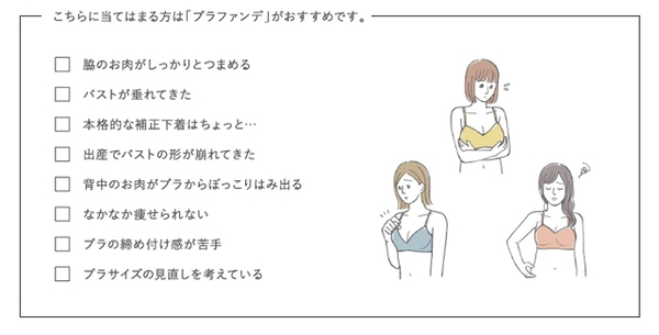 「ブラファンデ」は、ノンワイヤーの楽な着け心地なのに、立体パッドでバストをしっかり支え、丸みのある美しい形をキープします。さらに、 縫い目が一切ない完全無縫製で、縫い目の凹凸による肌への刺激も抑えた肌へのやさしさとバストメイクの両立を実現。本来バストにあるお肉が脇のほうへ流れてしまう「はみ肉」や、ボディラインの変化により今まで着用していたブラが合わないなど、体型の変化や下着に悩みをお持ちの方に特におすすめしたいブラジャーです。