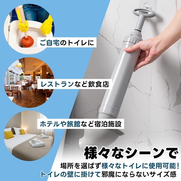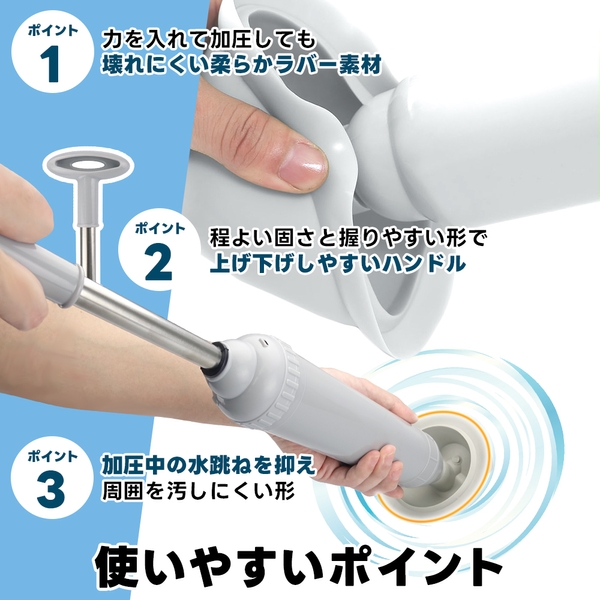 シンプルな操作方法で、誰でも簡単にトイレの詰まりを解消することができます。また、軽量設計なので、女性やお年寄りでも楽にお使いいただけるのもポイントの1つ。レバーを上下するだけで加圧した空気を放ち、詰まりの原因となるトイレットペーパーなどを押し流します。従来のカップだと操作しにくい…空気が漏れてしまう…などの使いにくいお悩みもこのアイテムが解決致します。