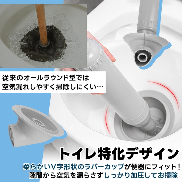 先端のラバーカップは特殊なV字形状を採用することで、幅広いタイプのトイレにしっかりフィット◎空気が漏れにくいのはもちろん、先端が細いので配管にもしっかりフィットし効率よく詰まりを押し流す事が可能です。家庭用としてはもちろんトイレの利用が多いオフィスや公共の場でも備えておくと安心なアイテムです。