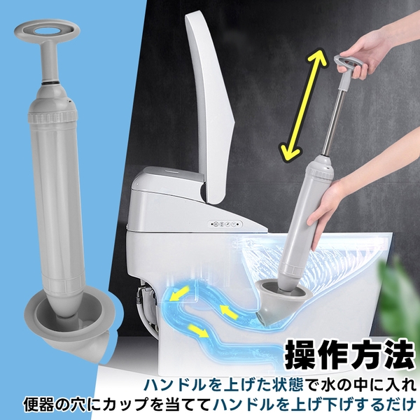 ハンドルを引き上げた状態でトイレ開口部に先端のラバーカップ部分をセットするだけで準備完了。次に素早くハンドルの押し引きをする事で加圧された空気が放たれ詰まりを押し流します。詰まりを解消するのに特別なコツが要らない手軽さも人気の秘密です。