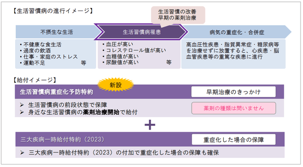 日本人の三大死因とも呼ばれる三大疾病のうち、心疾患、脳血管疾患の重大なリスク要因は高血圧性疾患や糖尿病等の生活習慣病であり、早期の段階での適切な治療や生活習慣の改善が重要です。そこで、生活習慣病の早期治療を促し、お客さまの健康を応援するため、高血圧性疾患や糖尿病といった生活習慣病により薬剤治療を受けた場合に給付金をお支払いする「生活習慣病重症化予防特約」を新設します。
