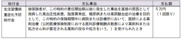 ※被保険者が、この特約の責任開始期以後の疾病を原因として発病した心疾患、脳血管疾患、糖尿病、高血圧性疾患・大動脈瘤等、肝疾患、膵疾患または腎疾患の治療を目的として、この特約の保険期間中に病院または診療所において、入院をしたときまたは手術を受けられたときは、その開始日に生活習慣病重症化予防給付金の支払対象となる薬剤治療を開始したものとみなします。
