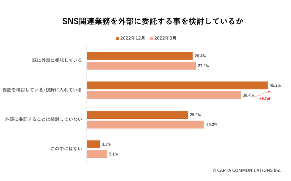SNS運用にかかわっている方々への質問で、「SNS関連業務の外部委託を検討している」と答えた方の割合は、2022年3月と12月では38.4%から45.2%に増加し、外部委託のニーズが増えている。