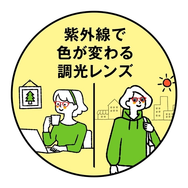 紫外線や光に反応して屋外などではレンズカラーが濃くなり、紫外線の少ない室内などではクリアに近くなるので、掛け替えることなく1本のメガネで対応が可能!お仕事にもプライベートにもさまざまなシーンに使えます。
