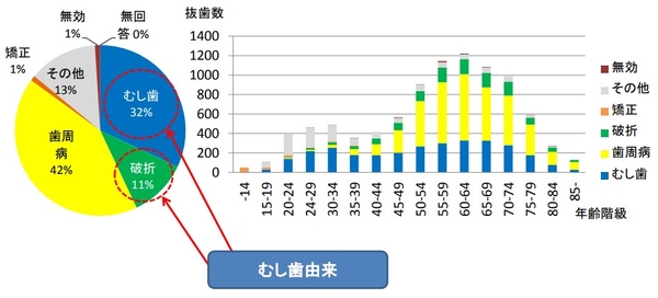 年齢が上がると歯周病も増えてきますが、20歳~40歳代は半数以上がむし歯由来で歯が失われているのが分かります。