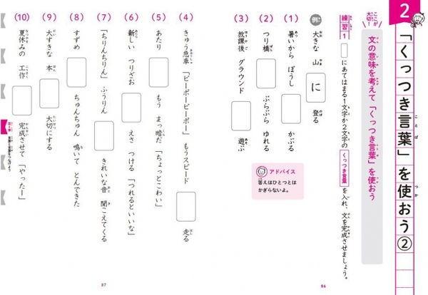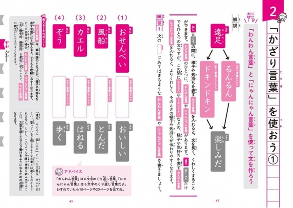 本書では、このメソッドをもとに、「わんわん言葉」「にゃんにゃん言葉」といった表現方法など、遊び感覚で語彙を増やしていく練習や、言葉と言葉をつなげるコツ、6つのシンプルな文章の「型」などを、順を追って練習することができます。また、保護者の方が子どもに「教えるときのポイント」や、日常生活でできる「トレーニング」なども紹介しています。