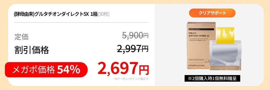 スペシャルイベント② メガポ限定!「エラスチンオリジナル7X」3箱購入時、「(酵母由来)グルタチオンダイレクト5X」の場合は2箱購入時、同じ商品1箱無料プレゼント!