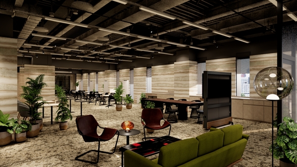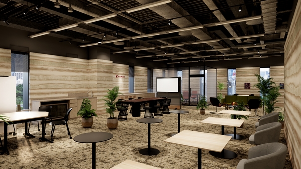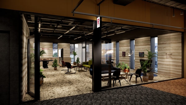 ROOTが起点となって未来社会に向けた多様かつ斬新なイノベーションが創出されていくことを願い、豊かな土壌を表現する版築左官仕上げの壁面を設え、ここにしかない空間をデザインしました。また、様々なアイデアや交流が蓄積していくことをイメージした地層柄に空間全体が包まれ、創作活動やディスカッションに没頭できる空間としました。