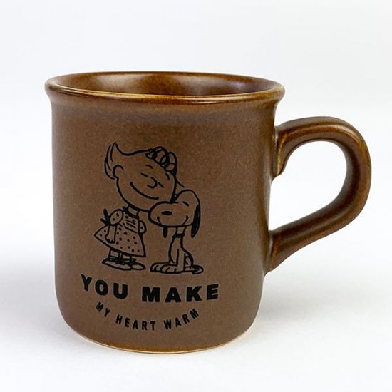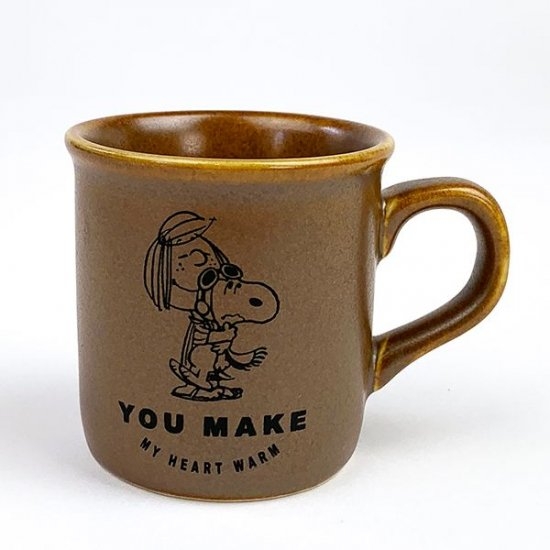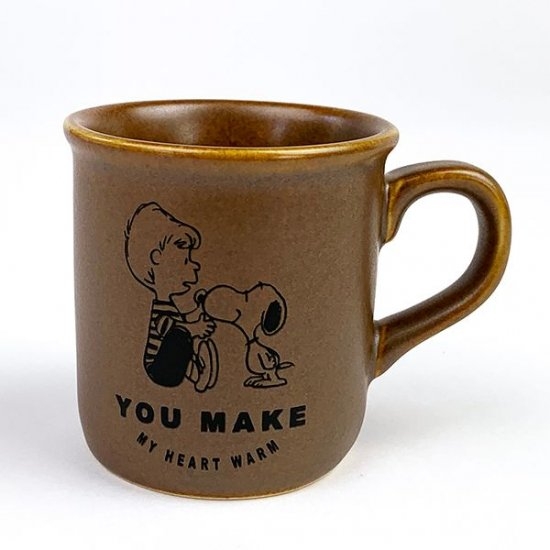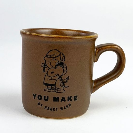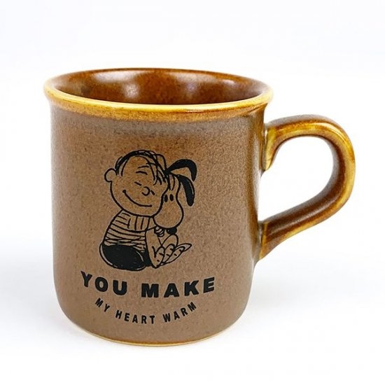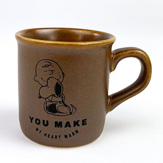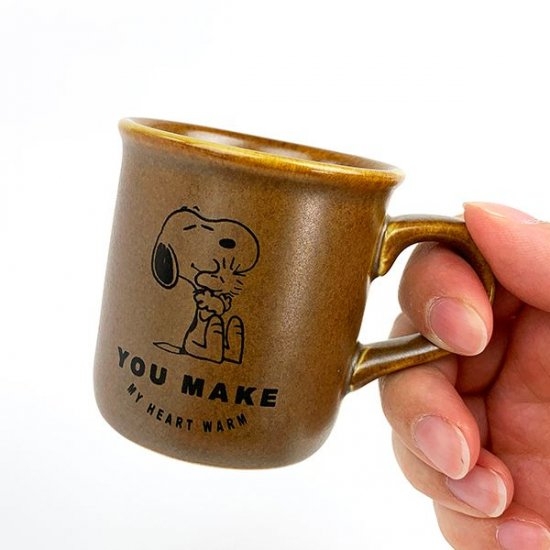味わいのある飴色のカップに、スヌーピーがウッドストックをギュっとしているデザインがとってもかわいいマグカップです。