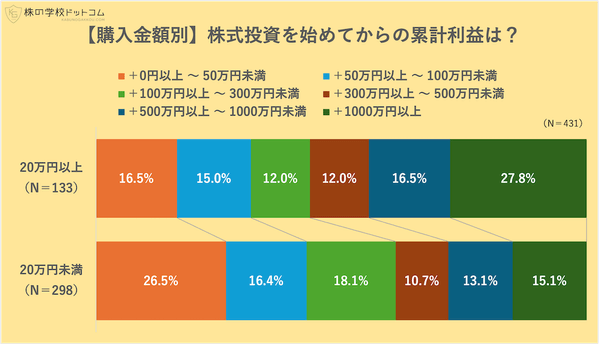 また、何も購入したことがない人よりも、株式投資について学ぶために教材等を購入したことがある人のほうが累計の利益額が大きくなっており、なかでも20万円以上の自己投資をしている人は、さらに利益を大きくすることに成功しているようです。